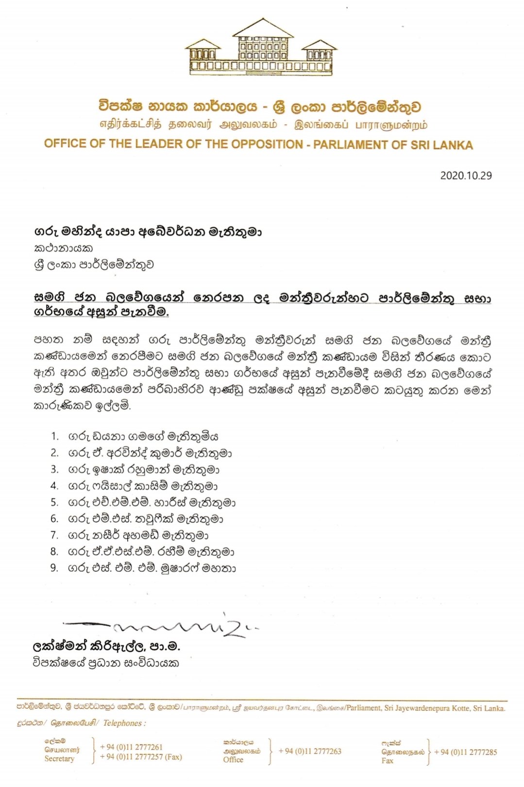 ஐக்கிய மக்கள் சக்தியின் ஒன்பது பாராளுமன்ற உறுப்பினர்களை கட்சியிலிருந்து நீக்கியுள்ளதாக கூறி, எதிர்க்கட்சியின் பிரதம கொறடாவான லக்ஷ்மன் கிரியெல்ல சபாநாயகருக்கு கடிதம் மூலம் அறிவித்துள்ளார்.